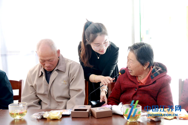 在“养生局——健康讲座”环节,来自镇卫生院的中医专家现场为爷爷奶奶把脉问诊,并普及健康养生知识。志愿者们端上菊花茶、重阳糕点,让爷爷奶奶品茶养生,并为他们捶肩、揉背、剪指甲,祝福他们永远健康快乐。