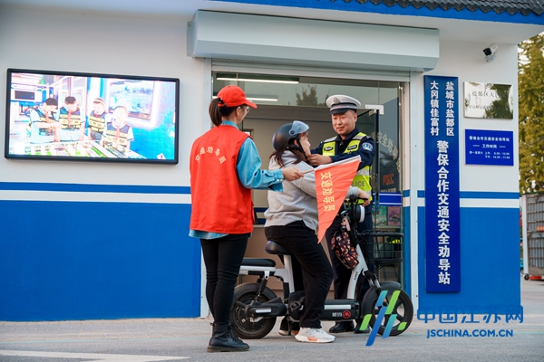 今年9月,在区交安委推动下,佳富村警保合作农村交通安全劝导站落地建成,这是盐都区已建成的12个村级劝导站之一,配有交通协警1人、人保公司1人、网格员3名,日常开展交通安全劝导、安全宣传、信息采集、隐患排查、协助事故处置、交通保险代办等工作。同时,村民足不出村,就能接受事故警示教育、体验头盔撞击、VR骑车盲区等多形式安全宣传。
