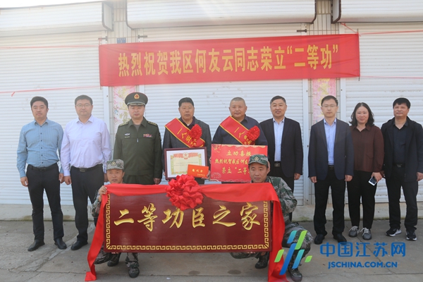 中国江苏网11月1日盐城讯 10月31日,盐城市亭湖区人武部、区退役军人事务局、新兴镇共同举办送喜报活动,向荣立“二等功”的现役军人何友云家庭表示感谢和热烈祝贺。亭湖区委常委、人武部部长常红旗,亭湖区退役军人事务局局长吕宝彬,新兴镇镇长刘加达,镇分管领导及相关部门参加活动。