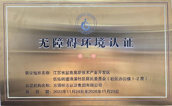 中国江苏网11月25日盐城讯 11月24日,由国家市场监督管理总局认证监督管理司、中国残疾人联合会维权部指导,国家市场监督管理总局认证认可技术研究中心、无障碍环境认证技术委员会、中国助残志愿者协会主办,北京市无障碍环境建设促进中心、中国残疾人事业新闻宣传促进会等单位联合承办的无障碍环境认证宣贯推广活动中,江苏省盐南高新区伍佑街道珠溪社区喜获全国首家二星级无障碍环境认证社区。