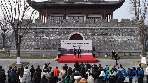 中国江苏网1月13日盐城讯 1月13日,盐城大洋湾生态旅游景区举办“世界最长的福主题石雕壁画长卷”认证仪式,见证该景区一幅名为“福润中华-延绵不绝”福字主题的“中国福长卷”石雕壁画创下了世界纪录。世界纪录驻华申报中心主任赵青太、世界纪录认证官马克西姆Maksim Kriukow、中方代表张朵朵及燕舞集团党委委员、副总经理李浩出席认证仪式。