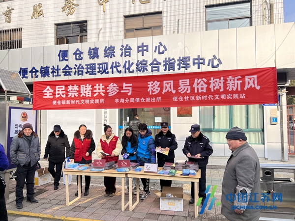 中国江苏网2月6日盐城讯 春节将至,为狠抓赌博风气,维护社会秩序,营造良好的“全民禁赌”氛围,提高人民群众远离赌博和举报赌博犯罪的积极性,保护人民群众财产安全,2月6日上午,盐城市亭湖区便仓镇新时代文明实践所、盐城市公安局亭湖分局便仓派出所、便仓镇便仓社区新时代文明实践站在便仓镇综治中心门口联合开展“全面禁赌共参与 移风易俗树新风”宣传活动。