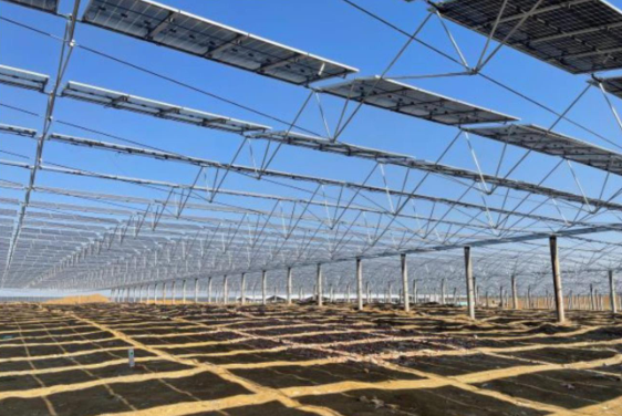 据悉,盐城市高新区污水处理厂分布式光伏发电项目采用了先进的预应力悬索光伏支架技术(柔性支架技术),合理利用空中资源。该技术通过“悬、拉、挂、撑、压”的空间结构技术,实现了柔性预应力钢绞线及刚性撑杆整体组合联结,辅以固结中间梁柱及阻尼器接地,构成了东西向大跨距桁架、组件带倾角(恒定)光伏支架系统。这一创新设计造型轻盈通透,柱网简洁,高度空间提升便利,地面资源可充分再利用。柔性支架部分的组件采用单排竖向布置,使用双玻双面发电组件,组件安装倾角为12°,组件最低点距离地面不小于5m。这样的设计既保证了光伏组件的最佳受光角度,又确保了安全运行的空间距离,柔性支架发电量提升约5.5%。