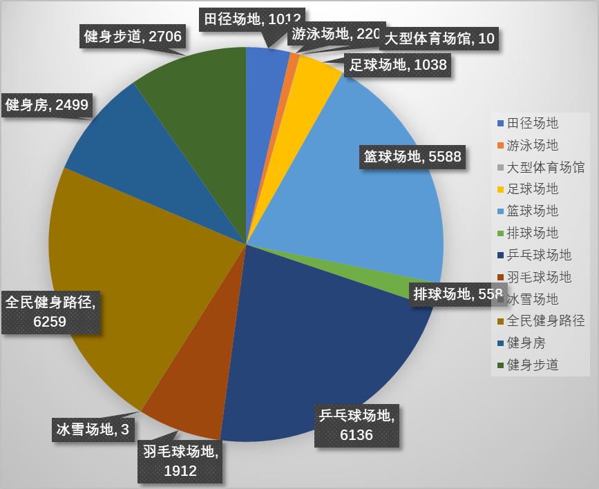 在球类运动场地方面,全市有球类运动场地16020个,其中,足球、篮球、排球“三大球”场地共7184个,占44.84%;乒乓球和羽毛球场地8048个,占50.24%;其他球类场地788个。全市足球场地1038个,场地面积352.45万平方米,其中,十一人制足球场地309个,七人制足球场地424个,五人制足球场地301个,沙滩足球场4个。全市篮球场地5588个,其中,篮球场4251个,篮球馆321个,三人制篮球场1016个。全市排球场地558个,场地面积17.9万平方米,其中,排球场530个,排球馆17个,沙滩排球场11个。全市乒乓球场地6136个,场地面积37.51万平方米,其中,乒乓球场3891个,乒乓球馆2245个。