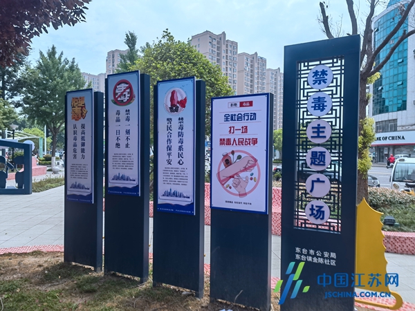 中国江苏网6月24日盐城讯 近年来,东台市深化禁毒宣传,着力打造禁毒名片。在6.26国际禁毒日来临之际,该市东台镇金陈社区建成全市首个“珍爱生命,远离毒品”禁毒主题广场。