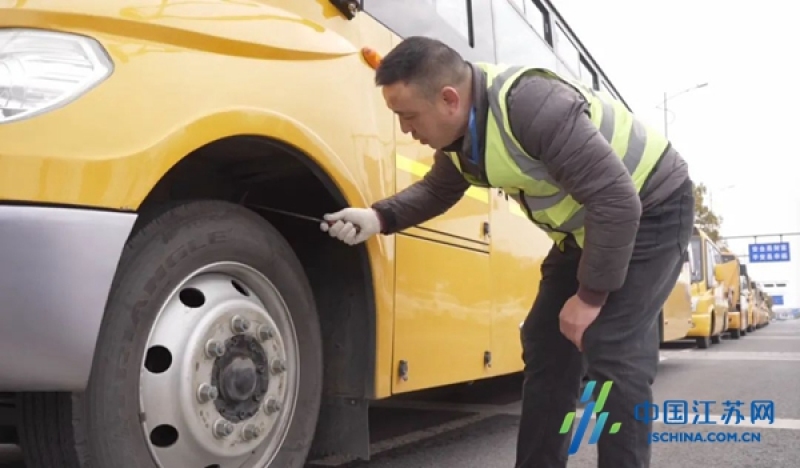 在盐城市松江路小学校车停放点,十余辆醒目的黄色校车整齐排列,工作人员对每辆车进行细致“体检”,从发动机运转是否平稳、轮胎胎压是否正常、制动系统是否灵敏,到安全锤、灭火器等应急设备是否完备,每一个细节都细致检查,坚决消除各类安全隐患,为孩子们的“上学路”提供坚实保障。
