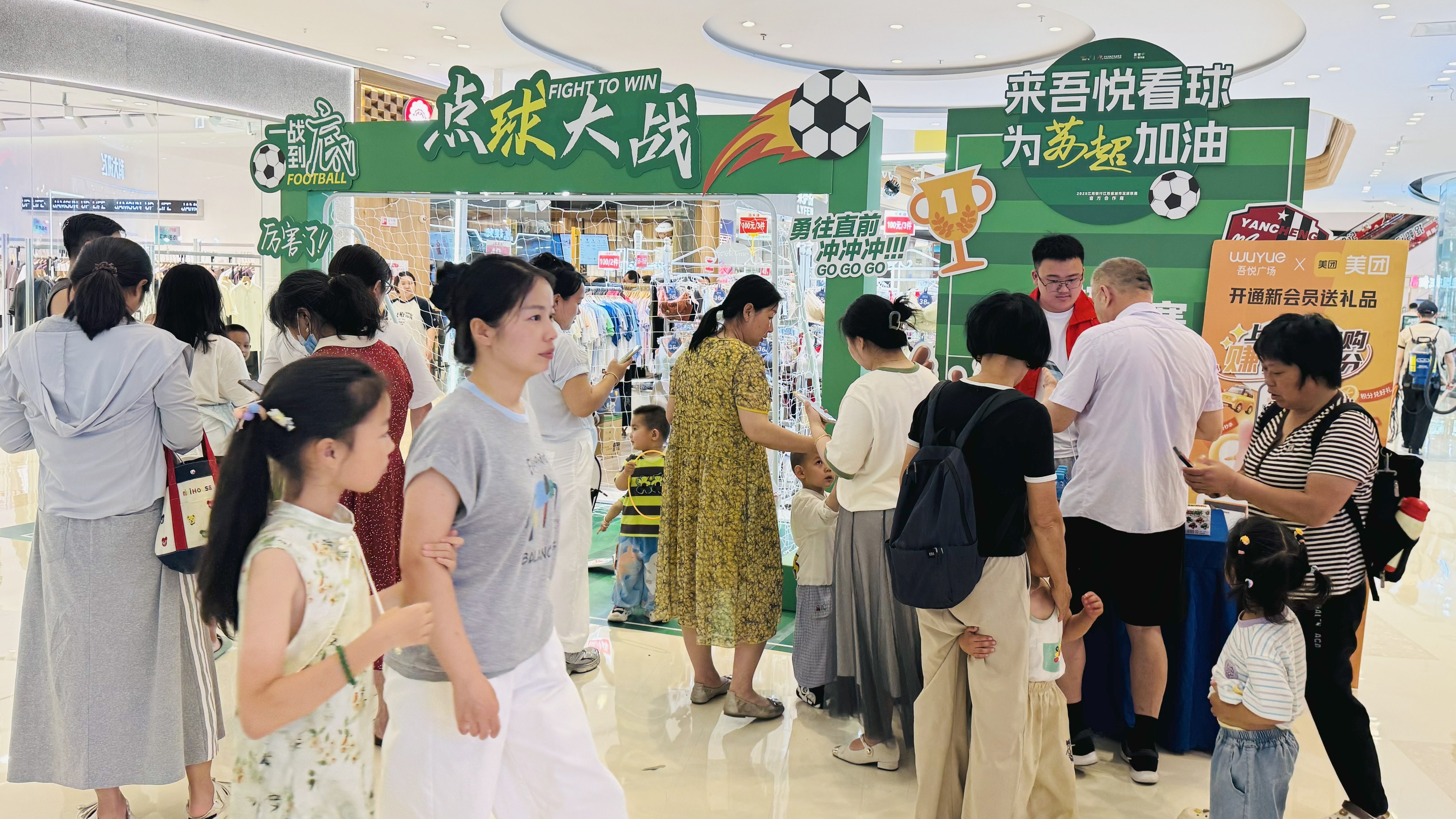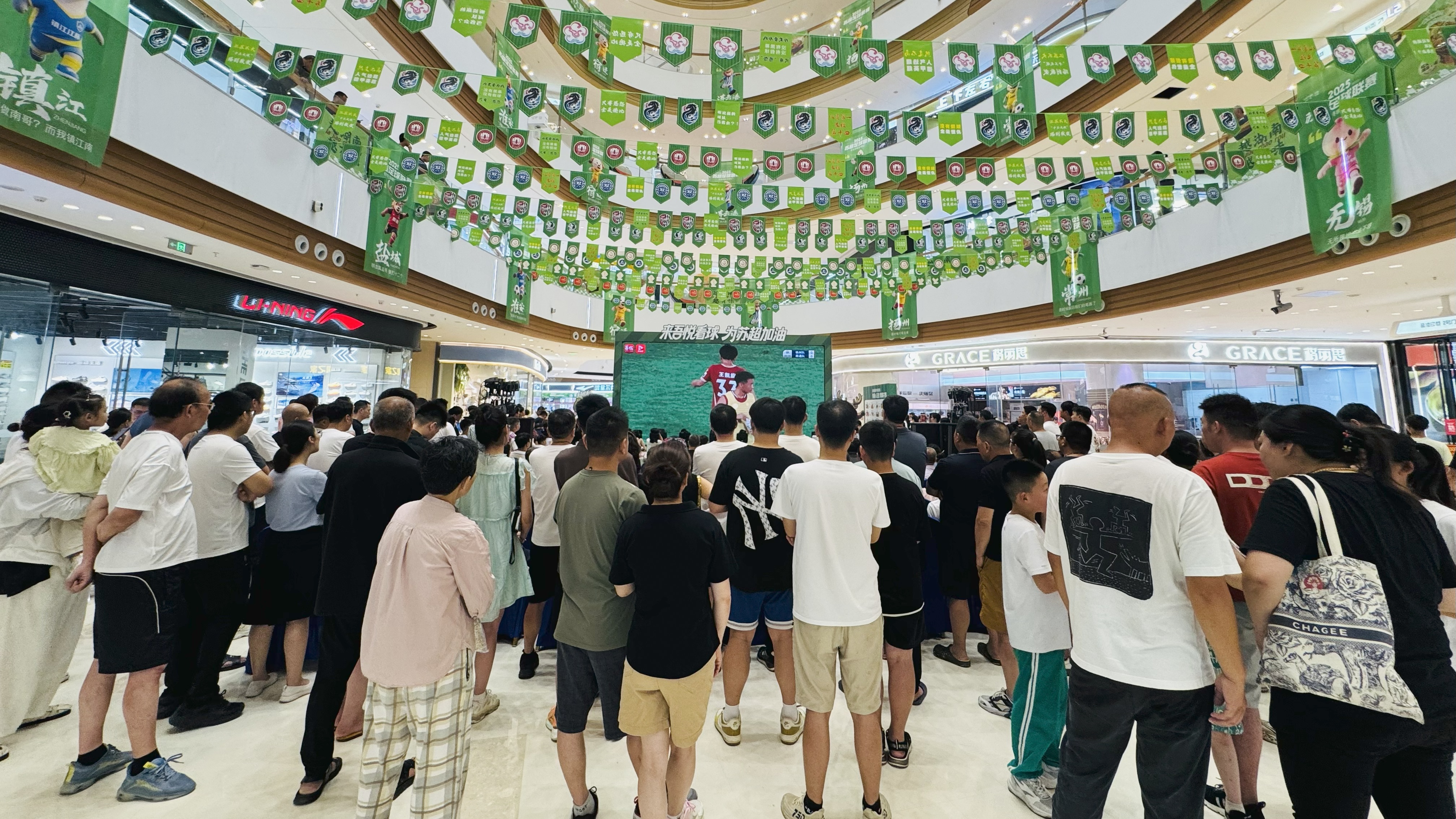 吾悦广场一楼大屏同步直播苏超比赛,吸引了大批市民群众驻足观看,现场气氛热烈,为周末的商圈增添了浓厚的体育氛围和活力。