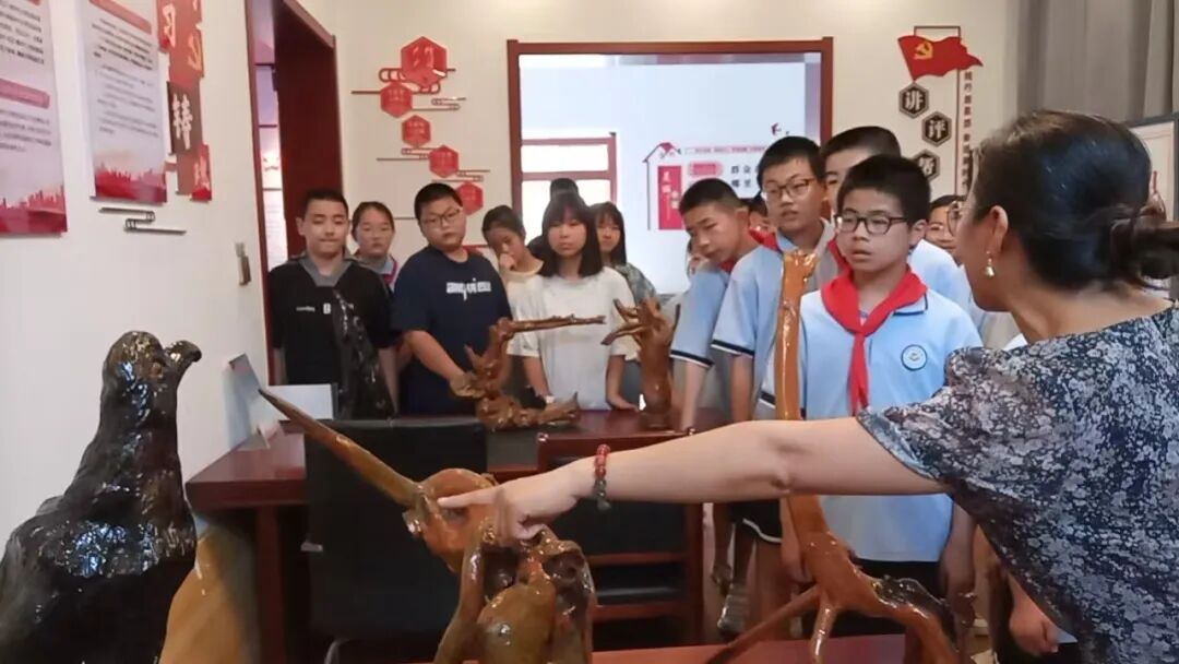 学富有着丰富的非遗文化资源,这次户外实践课程专门增加了非遗参观体验项目。孩子们在根雕非遗展区驻足观望,形态各异的根雕作品让大家眼前一亮:有的似猛虎下山,威风凛凛;有的如雄鹰展翅,气势磅礴;还有的像老者抚须,神态安详。“这些都是用树根做的?” 孩子们瞪大眼睛问。讲解员笑着点头:“每一件都是匠人师傅用心做的,他们把普通的树根变成了宝贝呢!”孩子们忍不住伸手触摸那些细腻的纹路,不停感叹“太厉害了!”