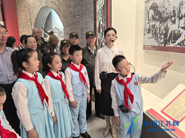 在“1944年8月,一架美国轰炸机轰炸日本本土后返航途中坠落在中国苏北地区,飞行员被新四军营救”展位前,队员王艺哲讲述《新四军营救美国飞行员的故事》。展览照片中欢迎美国飞行员的英文标语书写者、新四军3师政治部朱鸿之子朱宏佑介绍前年在美国与被营救飞行员交流的情况。