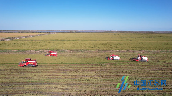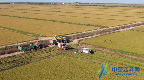 中国江苏网10月14日盐城讯 金秋十月,稻香沁人。在盐城射阳沿海滩涂,2.6万亩盐碱地种植的早稻迎来收获期。种植户抢抓晴好天气,机械轰鸣作业,一幅热火朝天的秋收画卷正徐徐展开。