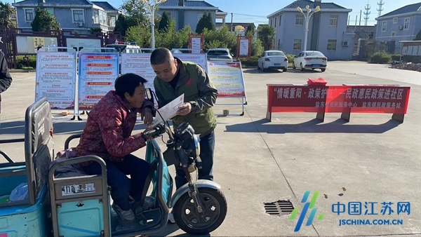 中国江苏网10月27日盐城讯 金秋送爽,孝亲情深。为积极应对人口老龄化,传承和弘扬中华民族尊老、敬老、爱老、助老的传统美德,营造全社会关爱老年人的温馨氛围,10月27日,盐城市亭湖区盐东镇便民服务中心联合盐东镇民政服务站,在东南村党群服务中心举办了“情暖重阳,政策护航”民政惠民政策进村(社区)活动。