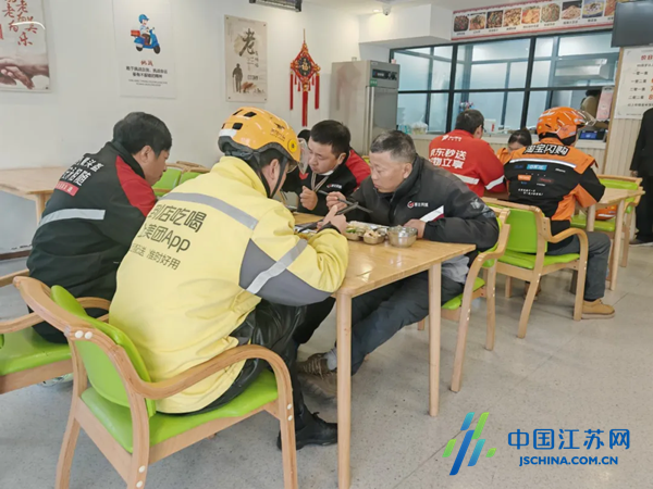 11月11日中午,依托社区“长者幸福食堂”服务与社区党群服务中心,盐都区潘黄街道东升社区“小哥食堂”正式投入使用。到饭点,“两新”组织专职党务工作者在食堂与外卖小哥、快递员们共进午餐。室外寒风凛冽,室内温暖如春,食堂就餐环境与机关餐厅相差无几。一份青椒肉丝、一份烧卜页、一份炖鸡蛋、一份炒菠菜以及一份青菜豆腐汤,“四菜一汤”仅收10元,而且口味相当不错。窗口大姐边服务边招呼:“汤和饭不够可以加,不收费呀!”快递小哥陈鹏说:“盐都的暖心驿站布点合理,我们在市区最远10分钟路程就可以到任何一个站点享受服务,刷卡即可进门,来到站点就像回到家一样。”