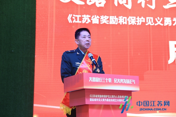 盐城市见义勇为基金会理事长沈洪清在致辞中向见义勇为英雄致以崇高的敬意,向长期以来关心支持见义勇为事业发展的社会各界人士表示衷心的感谢。他指出,见义勇为已成为盐城精神文明建设的一道亮丽风景线,希望社会各界一如既往地关心支持见义勇为事业发展,共同打造人人有责、人人尽责、人人享有的社会治理共同体。