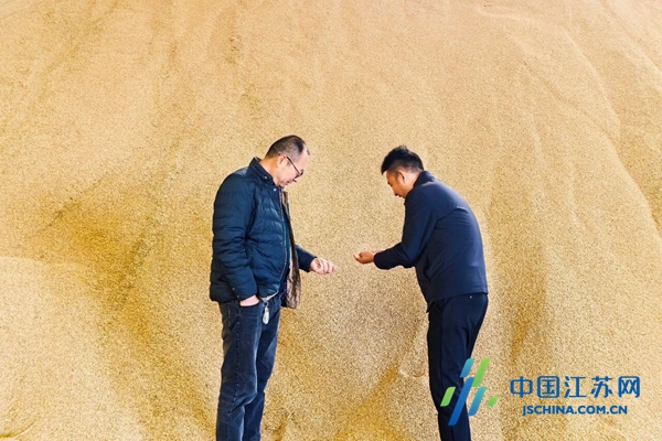 在亭湖区黄尖镇海波家庭农场的烘干车间,农场负责人顾海波和涵洞村党总支书记李勇一边查看设备,一边商讨来年的种植计划,言语间透露出对粮食生产前景的信心。