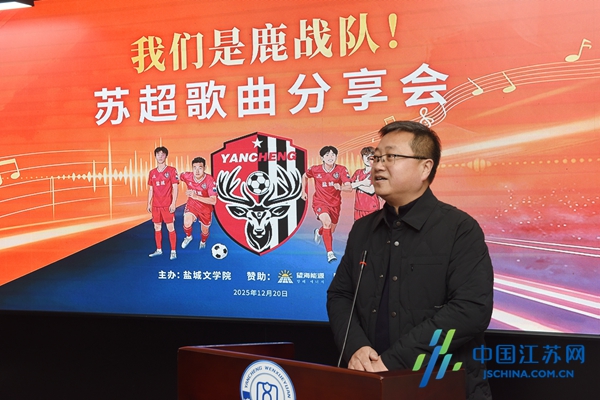 中国江苏网12月22日盐城讯 12月20日,“我们是‘鹿战队’——苏超歌曲分享会”在盐城文学院温情启幕。歌曲策划人、创作者、盐城文学院副院长陈雨刚现场分享创作心路,让这首点燃苏超赛场的金曲背后,城市与足球的深情联结再度引发共鸣。从赛场欢呼到全网热议,从单曲爆红到系列创作,《我们是“鹿战队”》不仅成为盐城队的精神图腾,更催生了席卷全城的“苏超鹿战队现象”,让足球文化与城市情怀深度交融。