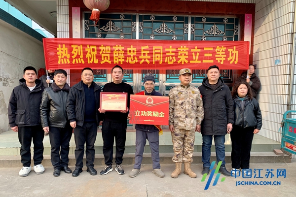 中国江苏网2月13日盐城讯 2月12日,古镇安丰锣鼓震天,荣光满城。东台市军地联合报喜团将“三等功”喜报送到现役军人薛忠兵家中,以最高礼遇致敬军属奉献。