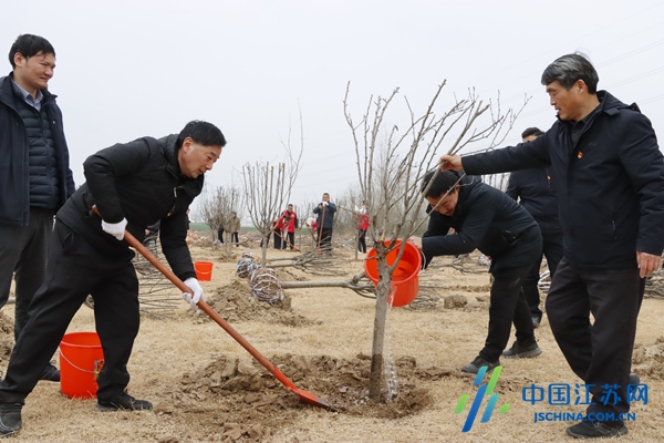 中国江苏网3月13日盐城讯 春风吐绿,草木初萌,正是植树添绿的好时节。3月12日下午,盐城市滨海县坎北街道积极响应绿色发展号召,组织开展义务植树活动,省生态环境厅第四专员办主任吕明光、驻盐城市环境监察专员龚海涛一行人来到坎北街道北海大道,与街道党工委班子成员、机关村居干群一同投入到紧张的植树劳动中。以实际行动为美丽家园增添一抹新绿,践行“绿水青山就是金山银山”的生态理念。