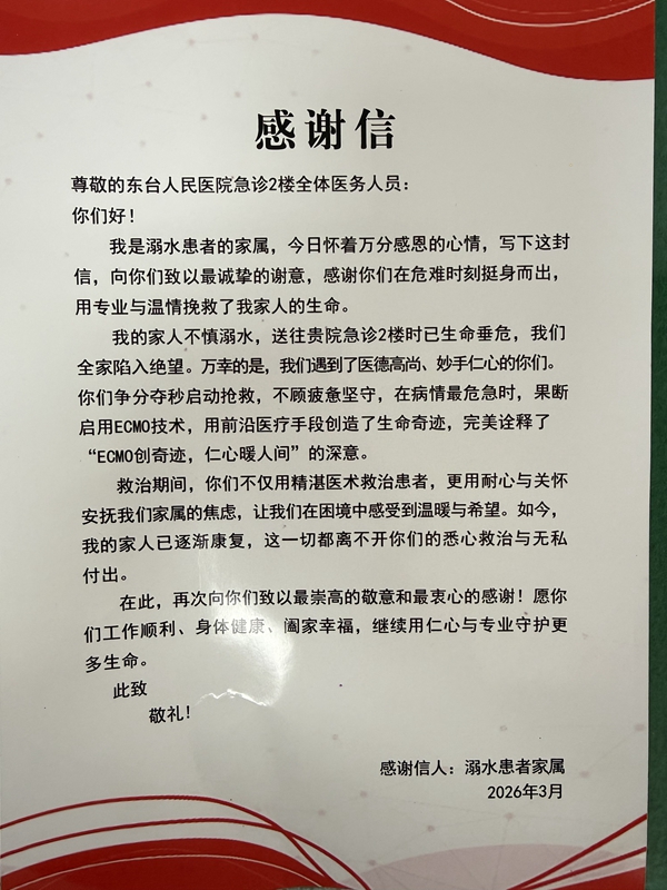 “现在父亲身体基本恢复了,真的很感谢医生。”张金祥的儿子张海讲述了事情的经过。他说,父亲今年61岁,家住东台五烈镇。3月13日下午,父亲在家附近的河边走路时突感头晕,不慎栽入河中,瞬间失去意识。“幸亏当时有人路过,不然后果不堪设想。”张海说,一位年过八旬的老人发现父亲落水后大声呼救,邻居闻讯赶来将父亲救起,并迅速拨打了120。父亲被送到医院时,状态已十分危急,随即展开紧急抢救。