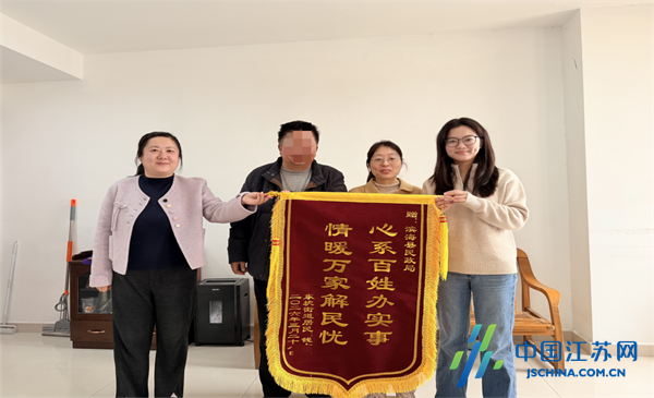 中国江苏网4月3日盐城讯 近日,盐城市滨海县东坎街道城南居委会居民钱先生将一面印有“心系百姓办实事 情暖万家解民忧”的锦旗送到滨海县民政局工作人员手中,感谢民政局工作人员在其儿子家庭陷入困境时给予的救助帮扶与暖心关怀。
