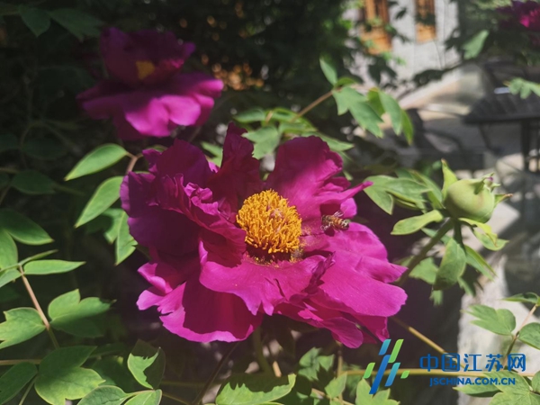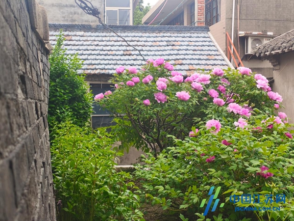 在南街51号的一尺花园(陈文杰故居)内,两坛百年牡丹倚靠着青砖黛瓦悄然盛开,引来不少游客驻足欣赏。东侧粉白的玉楼春正含苞待放,西侧紫袍牡丹已悄然绽放,硕大的花朵与古朴的建筑相映成趣,历史的气息与生命的绚烂在此交织。《伍佑镇志》载,这牡丹品种珍贵,相传为元末遗存,年年如期绽放,见证了古镇的沧桑变迁。该牡丹于2010年即被列为盐城市古树名木。2024年曾出现一年三次开放的奇迹。