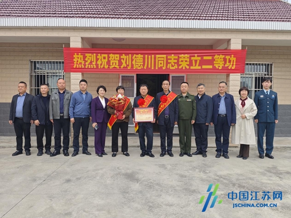 中国江苏网4月21日盐城讯 为进一步弘扬拥军优属光荣传统,营造尊崇军人、关爱军属的浓厚社会氛围,4月17日,盐城市亭湖区新兴镇联合区人武部、区退役军人事务局,为荣立二等功的现役军人刘德川家庭送去立功喜报。
