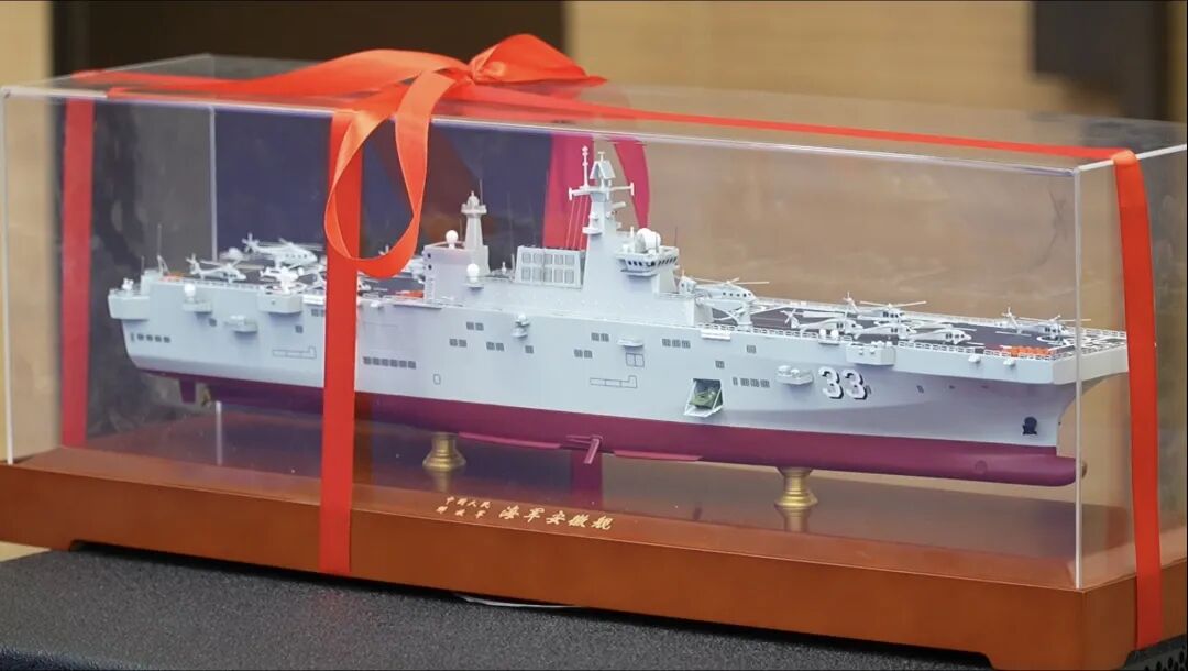 支队回赠的舰艇模型,以我国自主研制的新型两栖攻击舰为原型。这是万吨级的两栖作战平台,采用直通甲板设计,可同时起降多架舰载直升机,装载舱室能够容纳气垫艇、坦克及两栖装甲车辆等多种装备,拥有强大的立体登陆作战能力。海军某部军士王赫表示:“‘铁叉’是我们的根,舰模则代表着强军的未来。从红帆木船到万吨大舰,我们更要当好红色传人。”