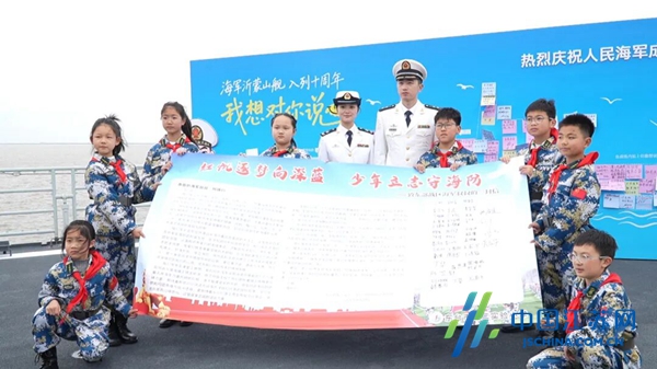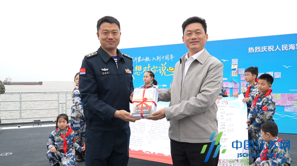 互赠仪式结束后,弶港小学师生代表受邀参观了支队军史长廊,并先后登上海军广西舰和沂蒙山舰,零距离感受战舰雄姿与海军官兵的军旅生活。活动现场,弶港镇小学向支队官兵深情朗诵了《铁军情 红帆颂》,并将一封写给海军叔叔的信以及《渔家的孩子爱大海》《红帆岁月故事集》等书籍赠送给部队,表达红帆少年对海军的敬意。