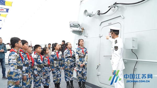 中国江苏网4月24日盐城讯 4月23日,人民海军成立77周年纪念日。上海宝山国际邮轮港,一场特殊的国防教育课火热开展。东台市人武部、弶港镇人民政府组织“盐城红帆少年军校”弶港镇小学的孩子们,一同登上海军沂蒙山舰,开启了一场沉浸式海防研学之旅。