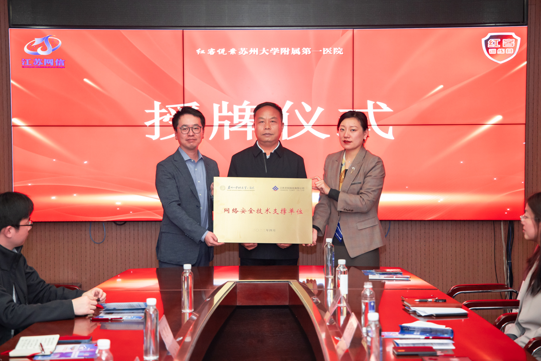 (从左到右:苏州大学附属第一医院信息处处长程思民、苏州市委网信办副主任李天德、江苏天创科技有限公司常务副总经理赵历)
