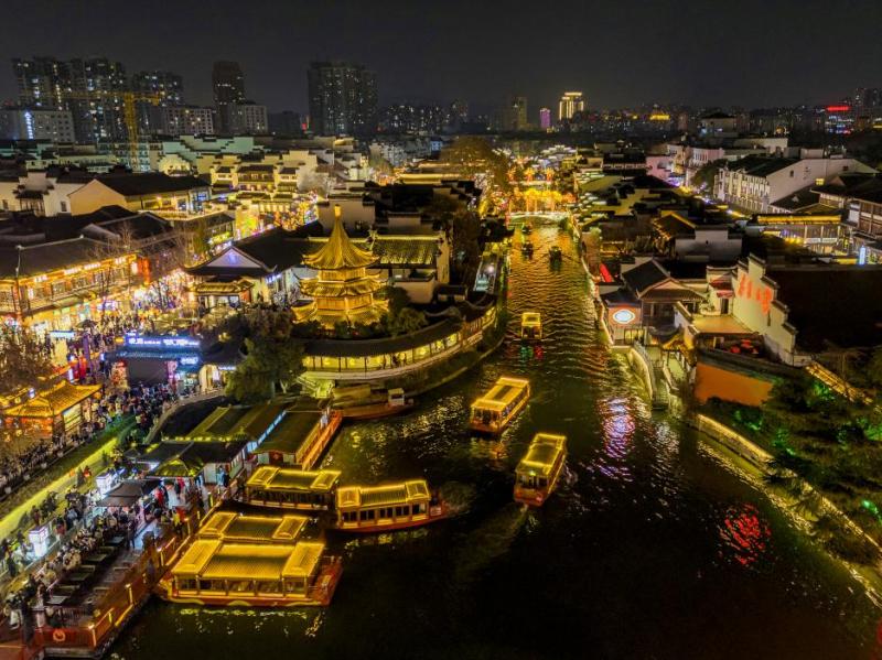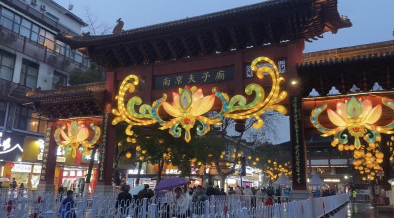 十里秦淮,流光溢彩,以传统手工艺扎制的花灯与通过现代科技制作的大型灯彩灯组交相辉映。