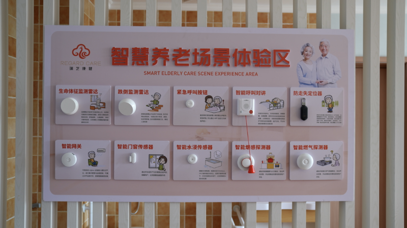 在瑞芝康健智慧养老场景体验区,连接不同功能的智能化装置正向咨询者展示居家养老新场景。从可及时报警跌倒行为的监测雷达到通过开合动作产生告警推送的智能门窗传感器,再到触发网关紧急报警的紧急呼叫按钮,多组并联设备覆盖居家生活可能产生的多种安全隐患。