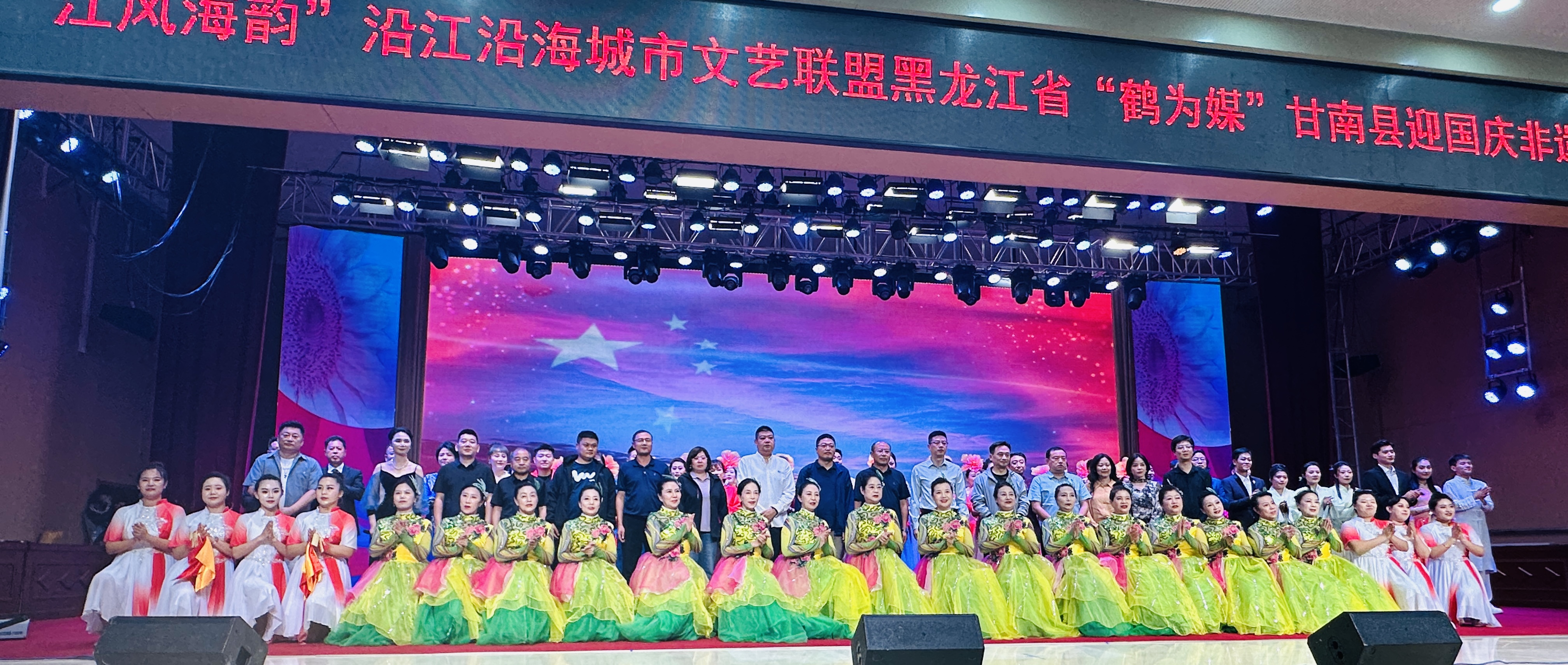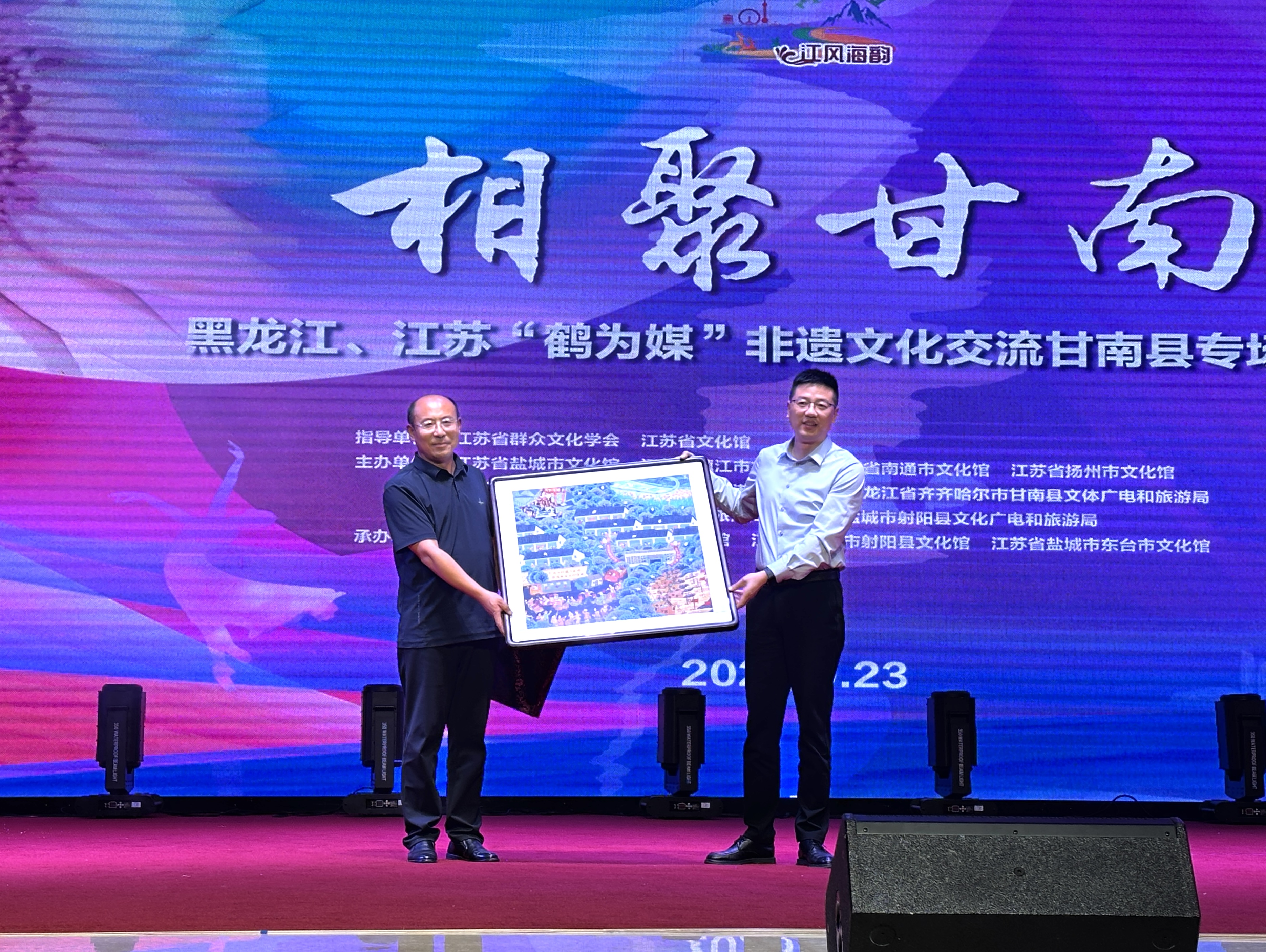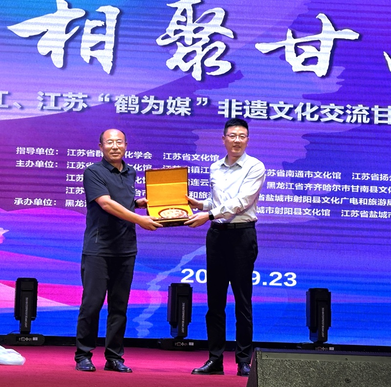 9月23日,由江苏省群众文化学会、江苏省文化馆联合指导,江苏省盐城市文化馆、江苏省镇江市文化馆、江苏省南通市文化馆、江苏省扬州市文化馆、江苏省泰州市文化馆、江苏省连云港市文化馆、黑龙江省齐齐哈尔市甘南县文体广电和旅游局、江苏省盐城市东台市文化广电和旅游局、江苏省盐城市射阳县文化广电和旅游局共同主办,黑龙江省齐齐哈尔市甘南县文化馆、江苏省盐城市射阳县文化馆、江苏省盐城市东台市文化馆执行承办的“江风海韵”沿江沿海城市文艺联盟“相聚甘南”黑龙江、江苏“鹤为媒”非遗文化交流甘南县专场巡演,在“中国向日葵之乡”甘南拉开帷幕。