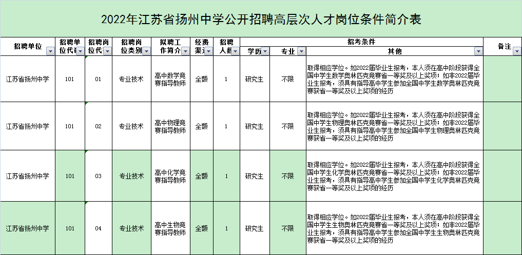 (四)符合《2022年江苏省扬州中学公开招聘高层次人才岗位条件简介表》(以下简称《岗位简介表》,附后)中各岗位所规定的具体资格条件;