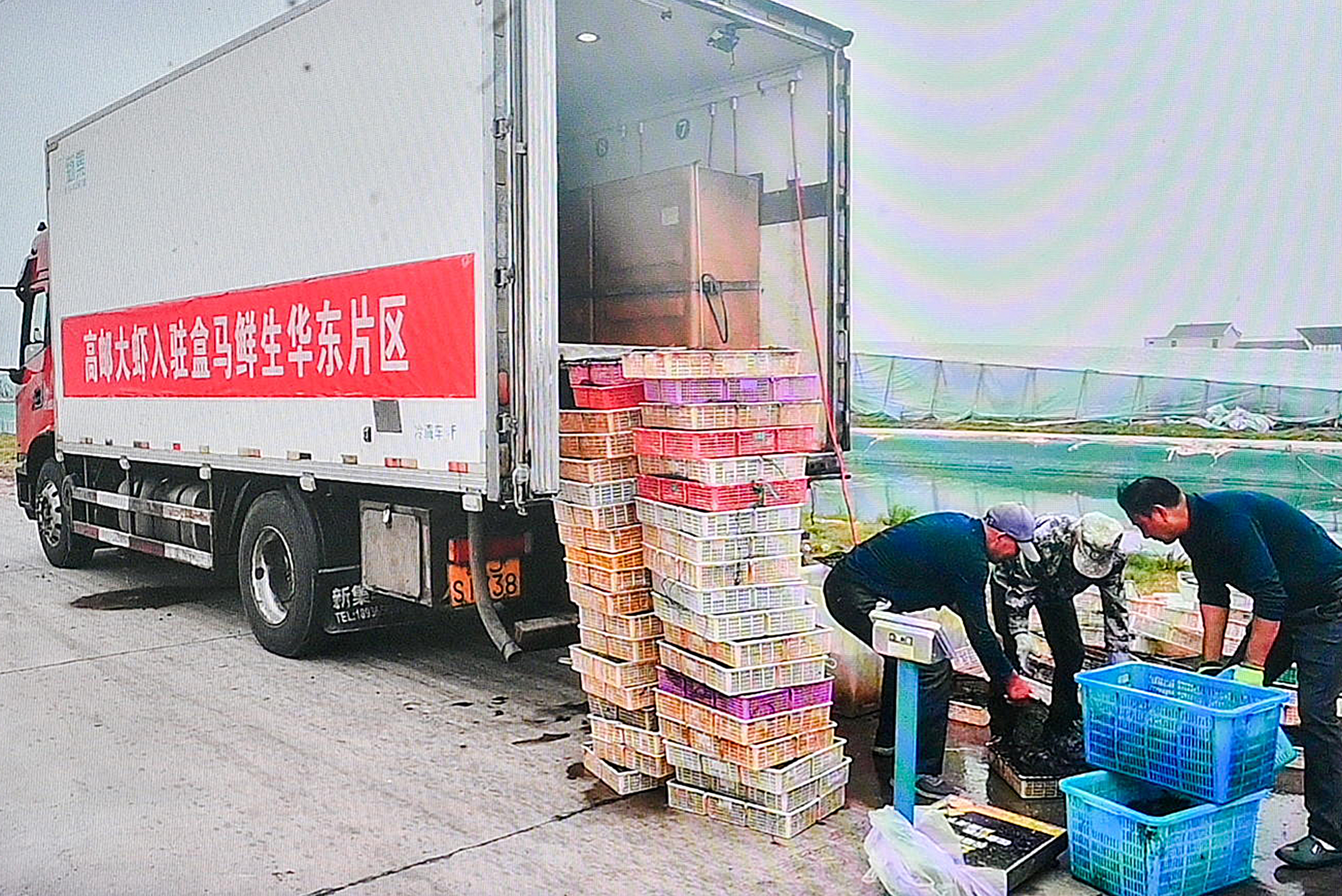 一边是火热的捕捞现场,另一边则是繁忙的装车场景。只见刚刚起水的大虾被工人们火速从大筐内分批转移到虾筐里,随后便被装上运输车。“示范园的高邮大虾品质好、活率高,深受市场青睐,这批虾将在5小时内先后在华东地区各家盒马鲜生门店上架,高邮吾悦广场的盒马鲜生也在其中。”盒马鲜生华东片区供应商曾嵘介绍,盒马鲜生华东片区几百家门店每日对高邮大虾的需求量约为3万斤,此次示范园的高邮大虾可谓是供不应求。