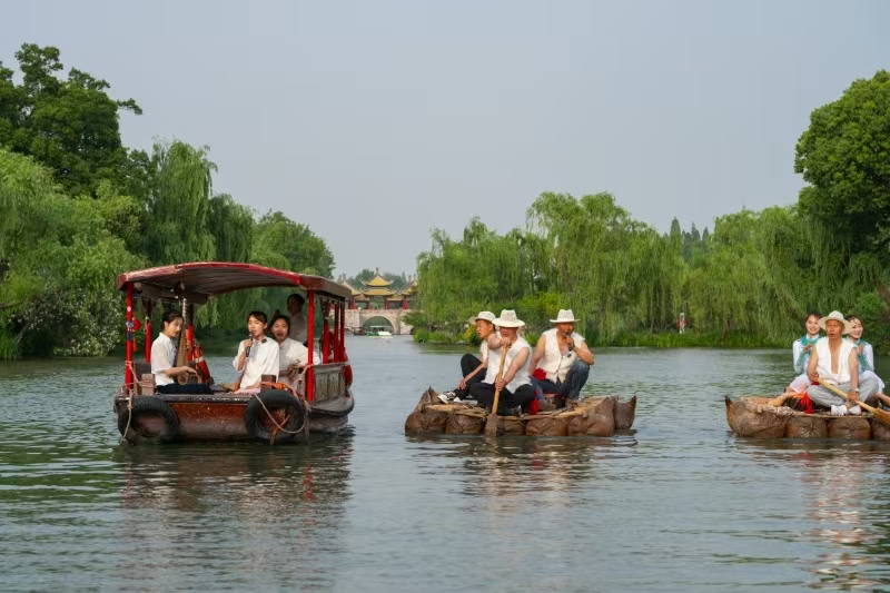 沙坡头筏工乘羊皮筏唱响“黄河号子”“宁夏花儿”,瘦西湖船娘摇乌篷船轻吟“扬州小调”“扬州民歌”,在碧波荡漾的瘦西湖上船筏相遇、景情共融,演绎一场跨江越河的文明对话。
