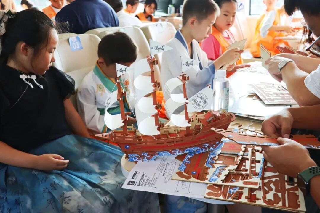 返程途中,船舱内开设了“非遗小课堂”。扬州木偶戏传承人举着木偶一亮相,孩子们的眼睛立刻亮了起来。小小的木偶演绎起运河传说,掌声、欢呼声此起彼伏。随后,孩子们在家长的陪伴中,亲手制作了属于自己的“手工商船”。当一艘艘迷你商船在桌上“启航”时,孩子们切身体会到传统文化的魅力与古老智慧。