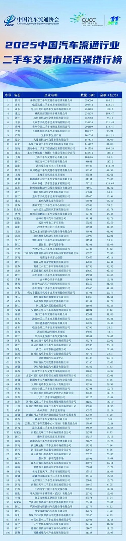 中国江苏网讯 近日,中国汽车流通协会主办的“2025年中国二手车大会”在重庆盛大召开。会议期间,2025中国二手车交易市场百强排行榜正式发布,江苏9家市场进入百强,其中,位于维扬经济开发区的扬州市旧机动车交易市场服务有限公司以交易量71059辆、交易额31.32亿元位列全省第一、全国第21位!