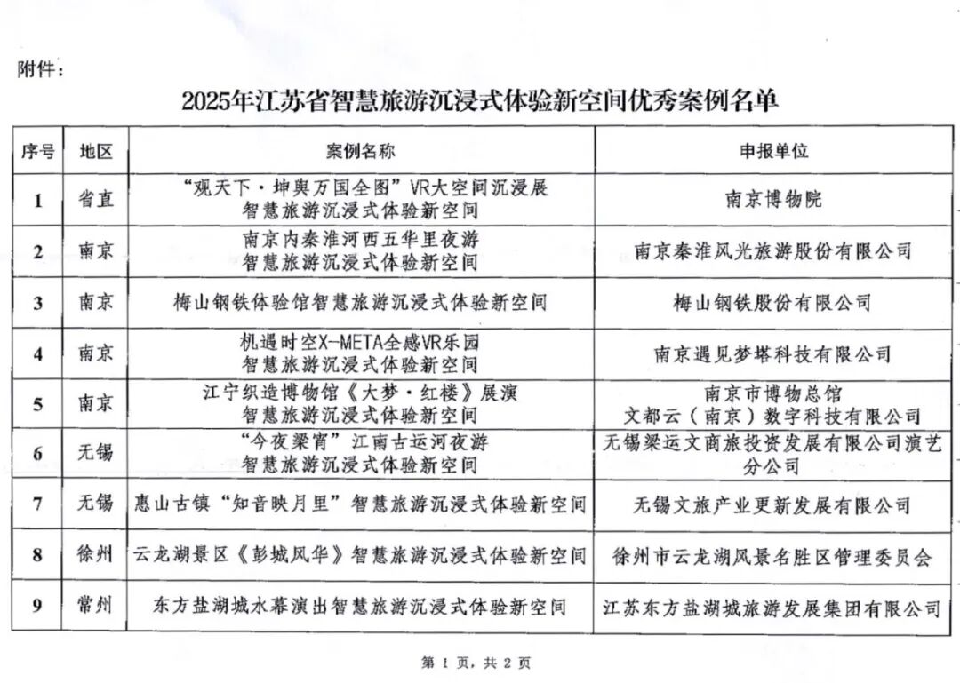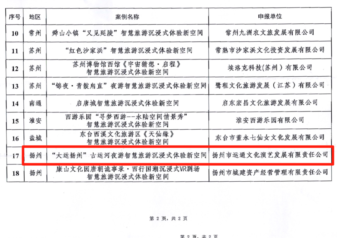 就在这样动人的夜色中,扬州传来了好消息——近日,江苏省文化和旅游厅公布2025年江苏省智慧旅游沉浸式体验新空间优秀案例,“大运扬州”古运河夜游智慧旅游沉浸式体验新空间成功入选,成为全省18个优秀案例之一。