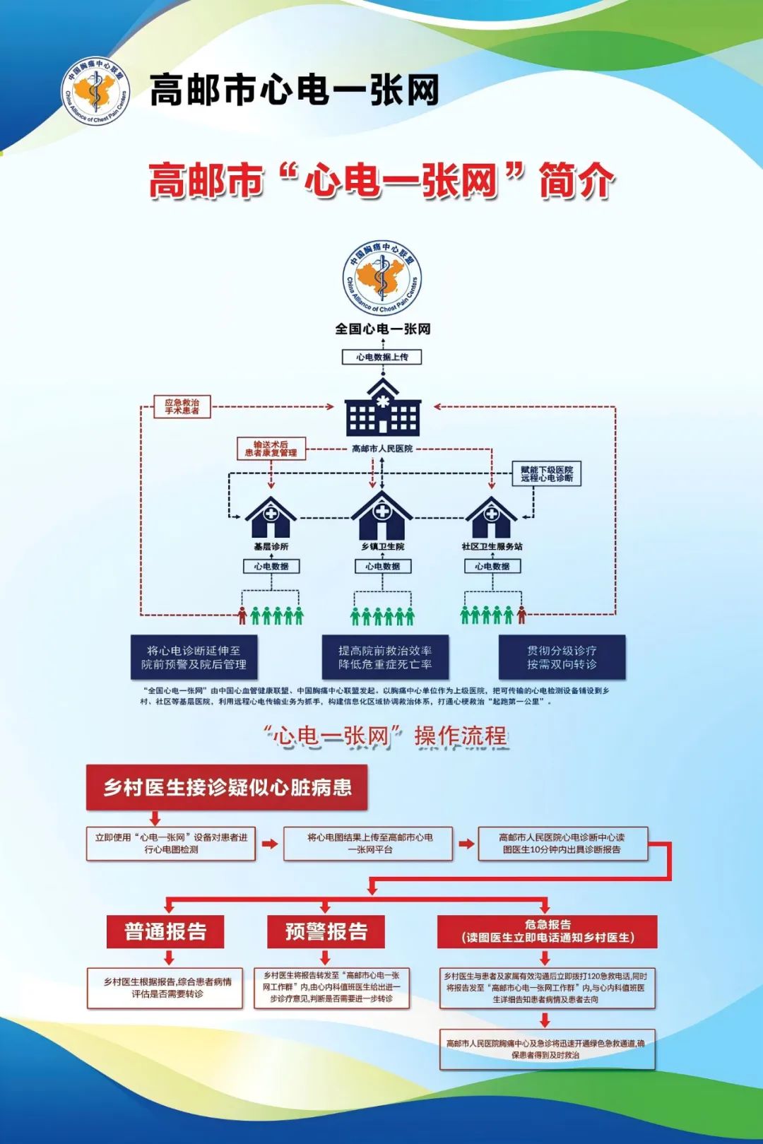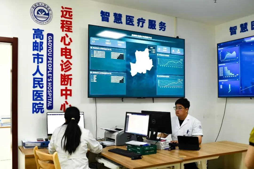 针对基层医疗机构心血管疾病诊断能力薄弱、急救响应效率低等痛点,2024年,高邮将“心电一张网建设”纳入了市政府民生幸福工程,并于当年9月20日启动实施。项目由市卫健委牵头,为全市160个村卫生室配备可穿戴便携式智能心电仪,依托高邮市人民医院心电诊断中心5-10分钟内远程出具结果,提供“基层采集—云端诊断—分级处置”闭环服务,实现“村卫生室首诊、乡镇卫生院转诊、区域救治单元接诊、市胸痛中心终诊”四级联动。
