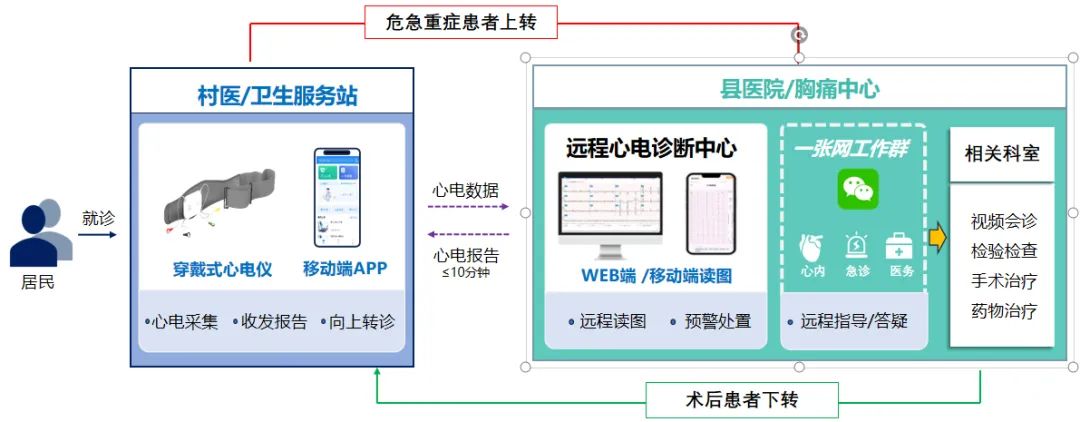 在具体应用过程中,乡村医生或家庭医生在村卫生室为患者采集完心电数据后,实时上传至全市“心电一张网”平台,由市心电诊断中心远程出具诊断报告,再由平台反馈给乡村医生。如遇危急报告,市120急救医疗站调度系统也同步收到预警;心电诊断中心和120值班人员立即对接乡村医生,迅速安排患者转诊;相关病情及去向及时同步报送至“心电一张网”工作群,市人民医院胸痛中心及急诊科开启急救绿色通道,保证患者得到有效救治,实现“基层检查、上级诊断、精准救治”的高效医疗服务模式。