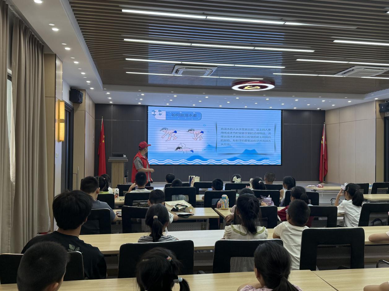 上周末,邗上社区辅导站的防溺水情景课堂上,孩子们头戴自制泳帽,在志愿者的专业指导下认真演练呼救动作。墙面上张贴的网络安全主题AI漫画格外醒目。