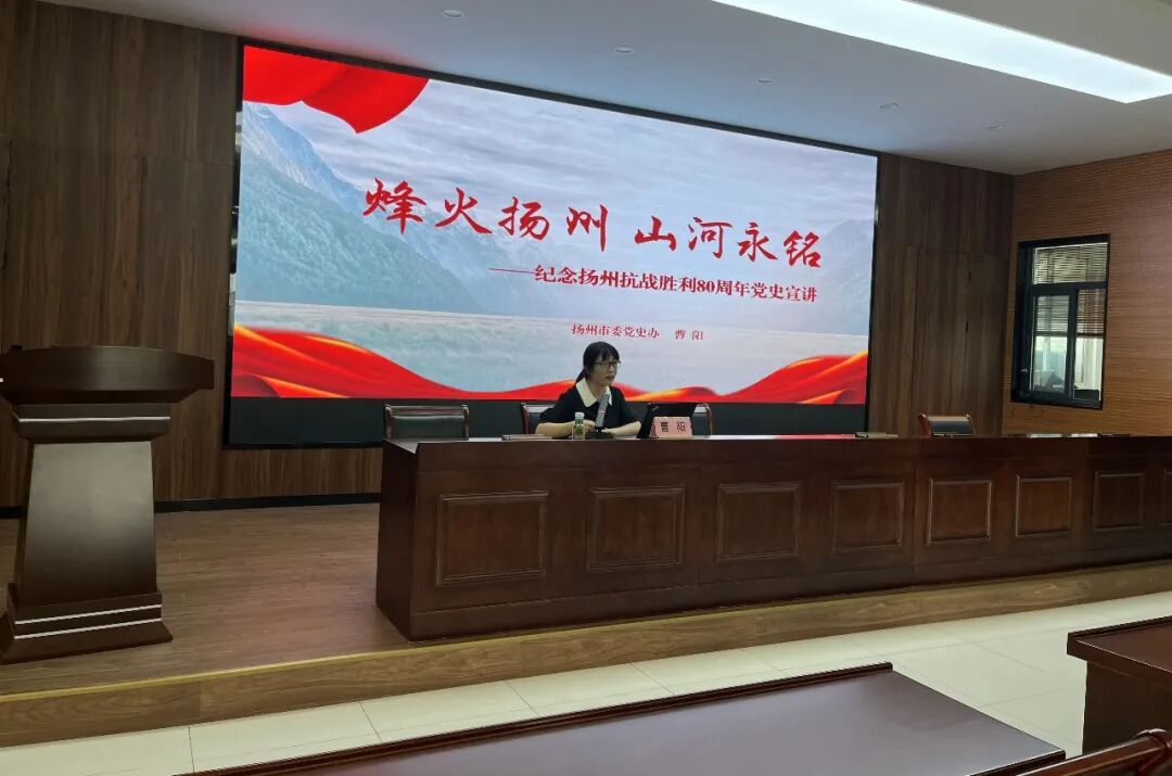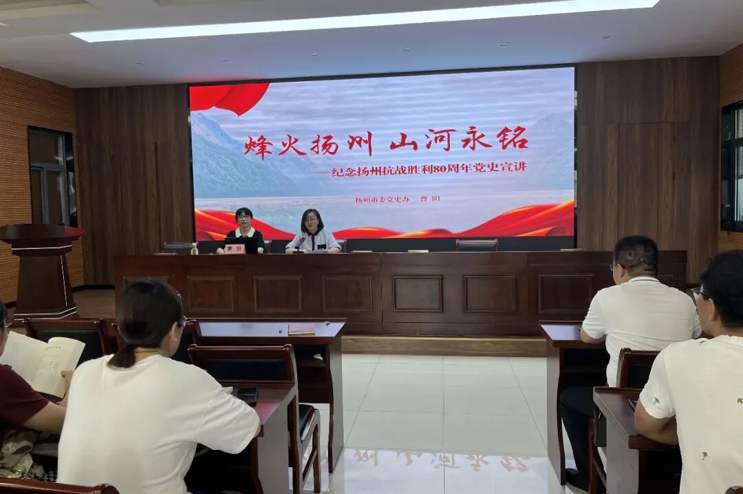 根据区委统一部署,活动特别邀请扬州市委党史办公室副主任曹阳同志作专题宣讲。曹阳主任长期致力于地方党史研究,对扬州地区革命斗争史有着深刻理解和独到见解。在热烈的掌声中,曹主任以“扬州抗战的光辉历程”为主题,从“烽火初燃——局部抗战中扬州抗日救亡运动的兴起”“铁血守土——战略防御阶段的扬州保卫战”“不屈脊梁——战略相持阶段的扬州敌后坚持”“浴火重光——战略反攻阶段的扬州解放”四个部分,系统梳理和生动讲述了扬州地区抗战的历史进程。宣讲史料详实、脉络清晰、重点突出、论述深刻,极具感染力和启发性,仿佛将大家带回到那段救亡图存、共赴国难的艰苦岁月,使在场人员深受教育与鼓舞。