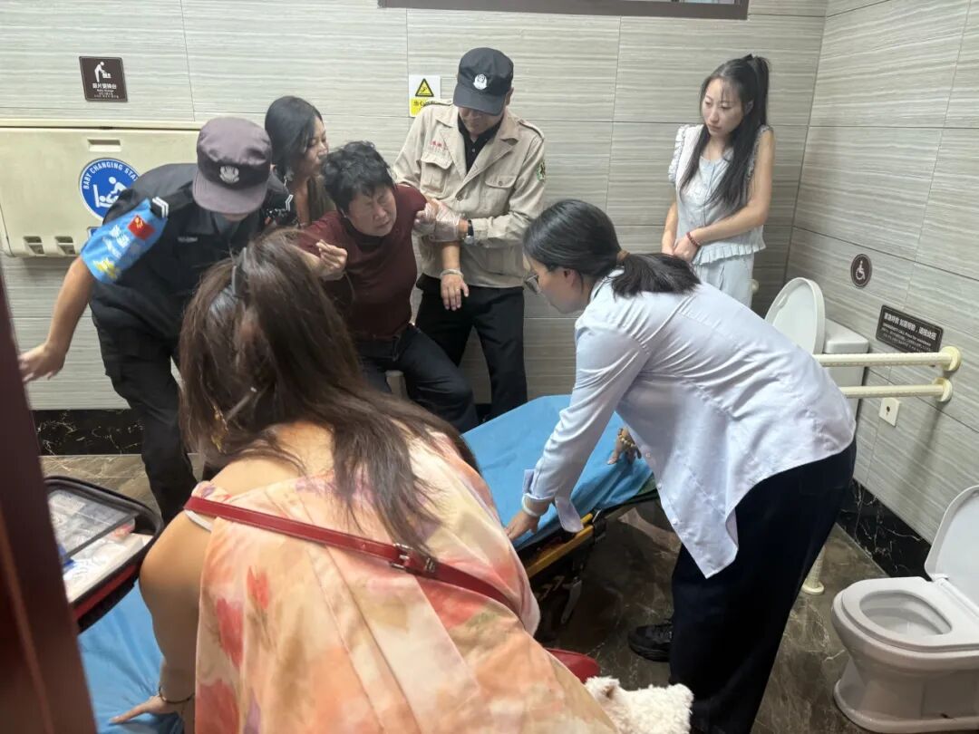 10月4日12时左右,一位女士匆忙赶到1757美食街坊南门厅饮料售卖点求助,称隔壁卫生间内有一位五十多岁的女士身体严重不适。工作人员赵鸿玲、朱玲霞、陈娅亚、姚蕾闻讯立即前往查看,在判断情况紧急后,迅速拨打120急救电话,清晰说明地点与患者状况,并规划出最快捷的通行路线。在等待救护车期间,她们耐心安抚家属情绪、悉心照看患者,并安排专人前往员工通道口等候,以便第一时间引导医护人员。救护车抵达后,她们高效引导救援人员抵达现场,并协助将患者送医。此次及时响应与妥善处置,不仅守护了游客的健康,更让“扬州温度”深入人心。