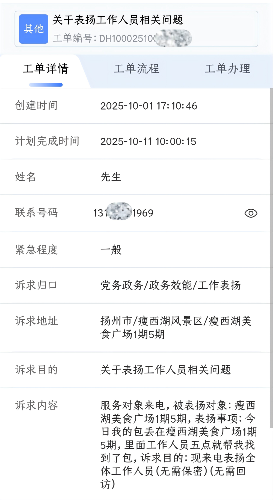 无独有偶,另一位游客也通过12345平台表达了谢意——他不慎将包遗失在瘦西湖1757美食广场,本已不抱太大希望,没想到广场工作人员早已在他们察觉之前找到失物并妥善保管。“从丢包到找回,全程没费一点劲,工作人员还主动联系我,太让人感动了!”游客由衷赞叹。