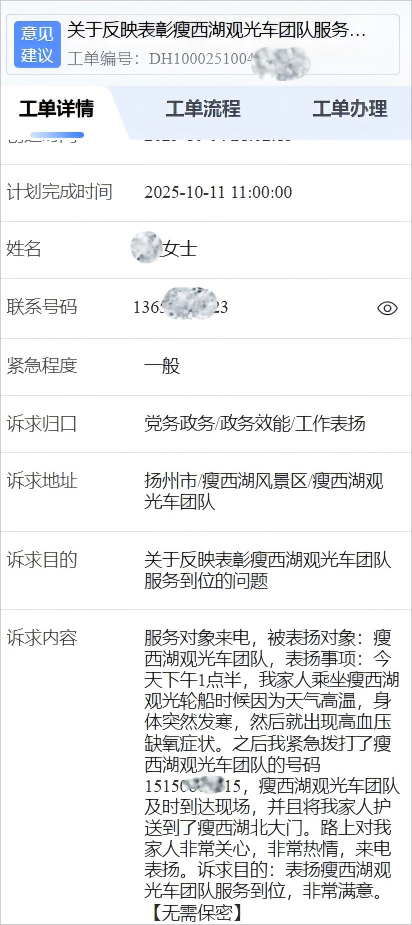 10月4日,12345政务服务热线接到一通特别的游客来电,专门表扬瘦西湖观光车团队。据游客描述,在某个高温天的下午1点半左右,其家人在乘坐瘦西湖观光游船时,因高温突发身体不适,出现发冷、高血压缺氧等危急症状。情急之下,游客紧急联系观光车团队求助。团队接电后迅速响应,立即赶往现场。