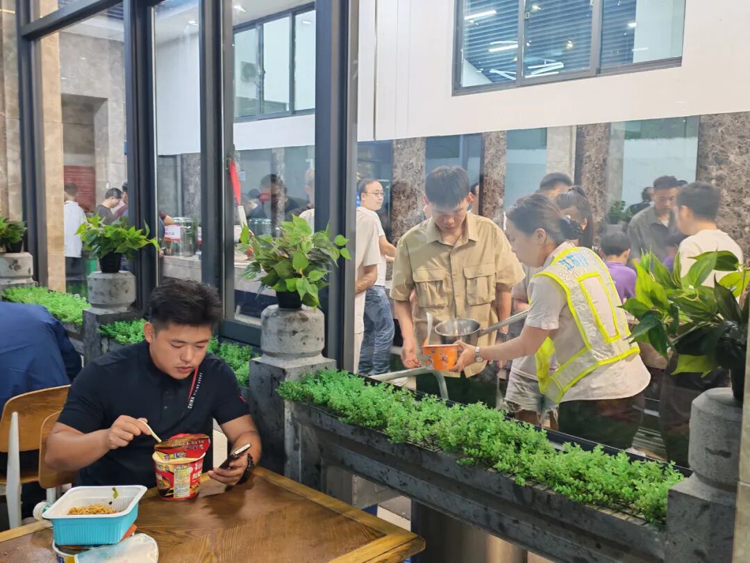 面对客流高峰,他们在超市外设立临时售卖点,供应方便面、饮用水等热销商品,并提供方向指引等信息咨询服务,有效分流顾客,缓解室内超市排队压力。当遇到开水供应紧张时,他们又化身“烧水专员”,主动为旅客冲泡方便面并贴心提醒小心烫伤,于细微处传递温情。在出入口、充电桩等易堵点,他们积极配合现场工作人员疏导车辆,保障区内主干道通畅,避免车辆积压影响主线通行。
