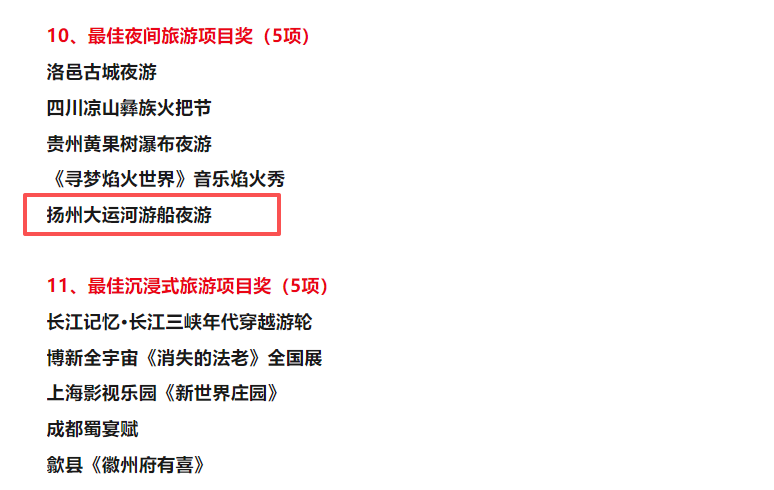 其中,“大运扬州”古运河行进式游船演艺凭借深厚的文化底蕴与创新的体验设计,成功入围“最佳夜间旅游项目奖”。