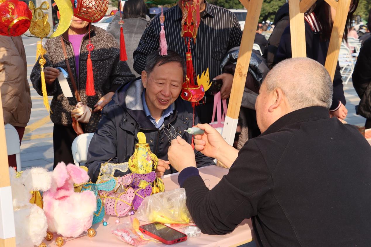 隔壁的扬州灯彩传承人陈志康则带来了刚完成的迷你龙灯与荷花灯,斑斓的色彩在阳光下格外耀眼。“做一盏龙灯要经过绘图、塑形、裱糊、粘贴等七道工序,光龙头就得花上大半天。”陈志康手持竹篾灵活弯折,很快扎出一个精巧的灯架雏形,他还现场展示了创新设计的迷你灯组,“以前彩灯太大不好存放,现在做了小巧的款式,既能当装饰又能让更多人玩上手。”人们围在展台前,学着用彩纸粘贴灯面,陈志康穿梭其间指导:“边角要贴平整,透光才好看。”不一会儿,一个个带着童趣的简易彩灯便在孩子们手中诞生,灯光亮起时,现场满是欢笑声。