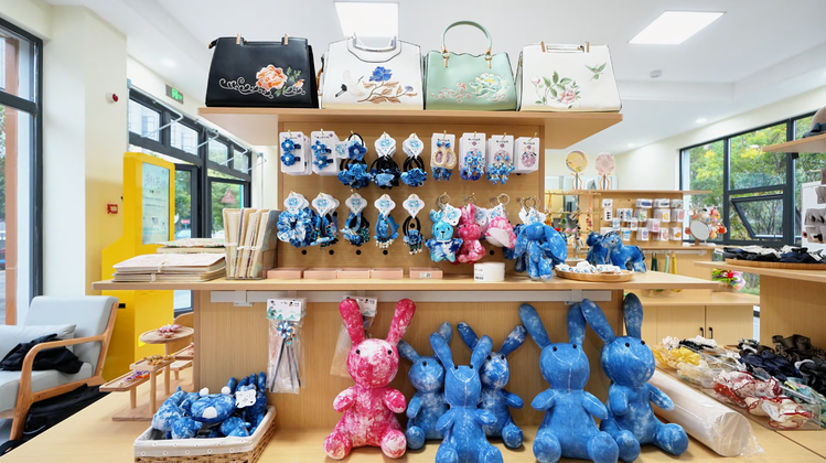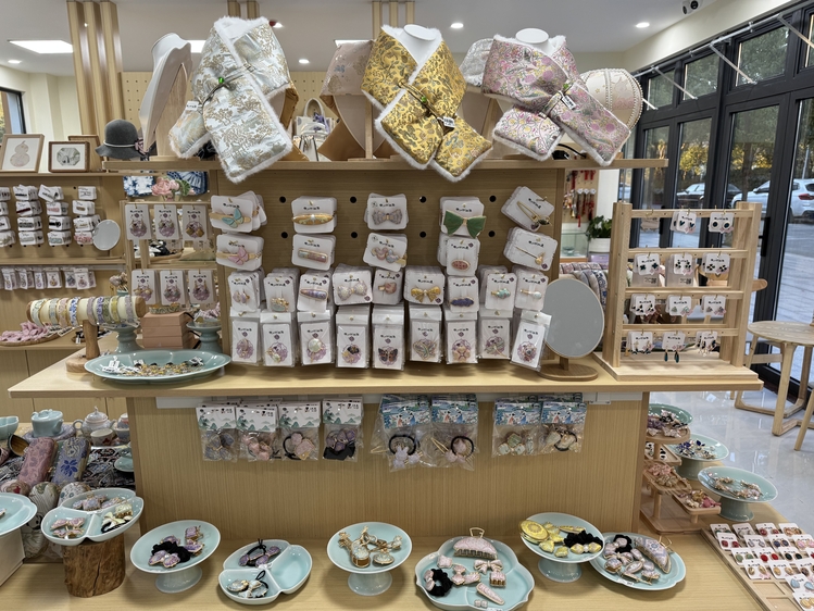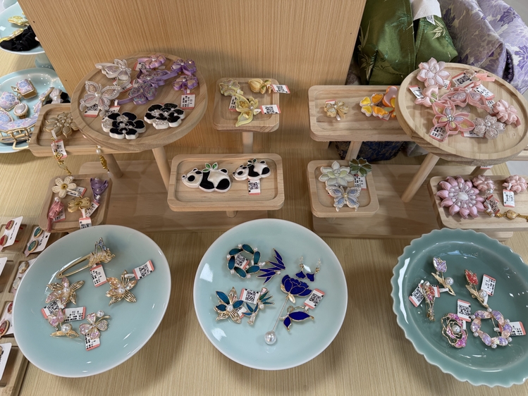 在工坊里慢慢走、细细看,会发现这些手工艺品藏着许多巧思。华美的非遗宋锦、韵味独特的扎染、精巧的盘扣、绚丽的点翠,还有朴拙的手工钩织,都被巧妙融入日常佩戴的发饰、胸针和围脖中,款式别具一格。更特别的是,每件商品的吊牌上除了品名、材质、价格,还附有手艺人的署名——这不仅是为了计酬,更是为了让她们亲眼看见自己的作品被认可、被喜爱、被带走。这份清晰的“被看见”,比什么都珍贵。