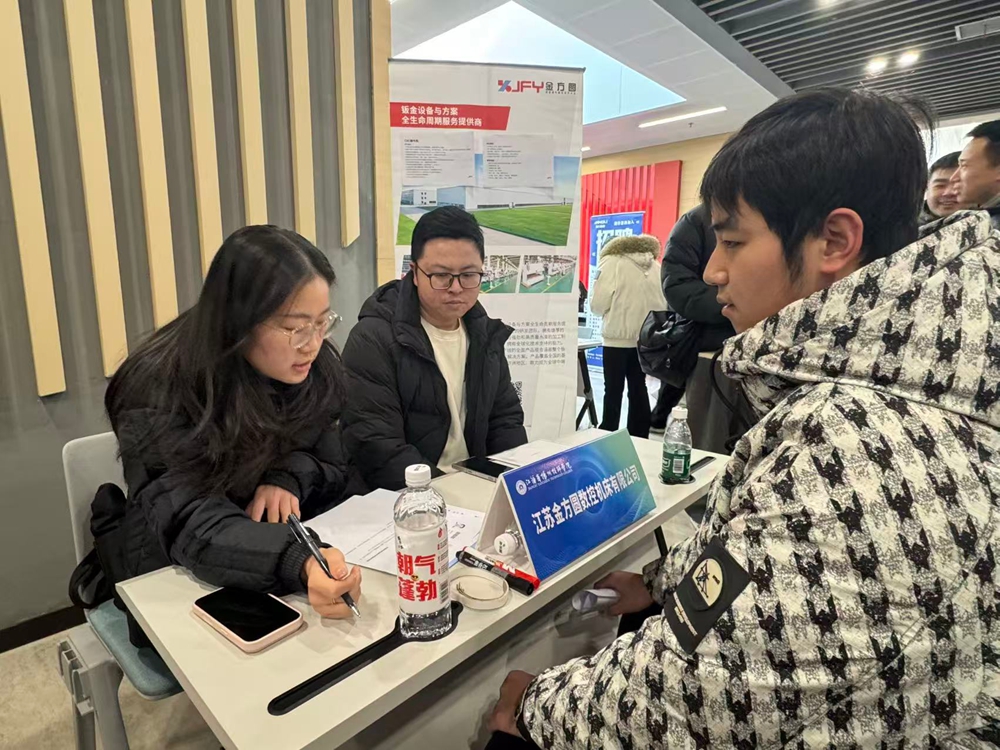 招聘现场呈现供需两旺、岗位多元的特点。学生们手持精心准备的简历,与招聘人员积极沟通交流。扬州日新通运物流装备有限公司招聘的岗位从新媒体文员、生产一线类基础岗位,到电气工程师等高技术岗位,均有涉及。待遇从年薪7.2万元到14.5万元不等。